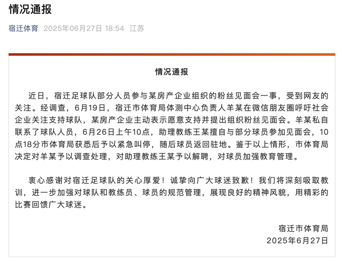 我们6月27日,宿迁市体育局发布情况通报:近日,宿迁足球队部分人员参与某房产企业组织的粉丝见面会一事,受到网友的关注。经调查,6月19日,宿迁市体育局体测中心负责人羊某在微信朋友圈呼吁社会企业关注支持球队,某房产企业主动表示愿意支持并提出组织粉丝见面会。羊某私自联系了球队人员,6月26日上午10点,助理教练王某擅自与部分球员参加见面会,10点18分市体育局获悉后予以紧急叫停,随后球员返回驻地。鉴于以上情形,市体育局决定对羊某予以调查处理,对助理教练王某予以解聘,对球员加强教育管理。